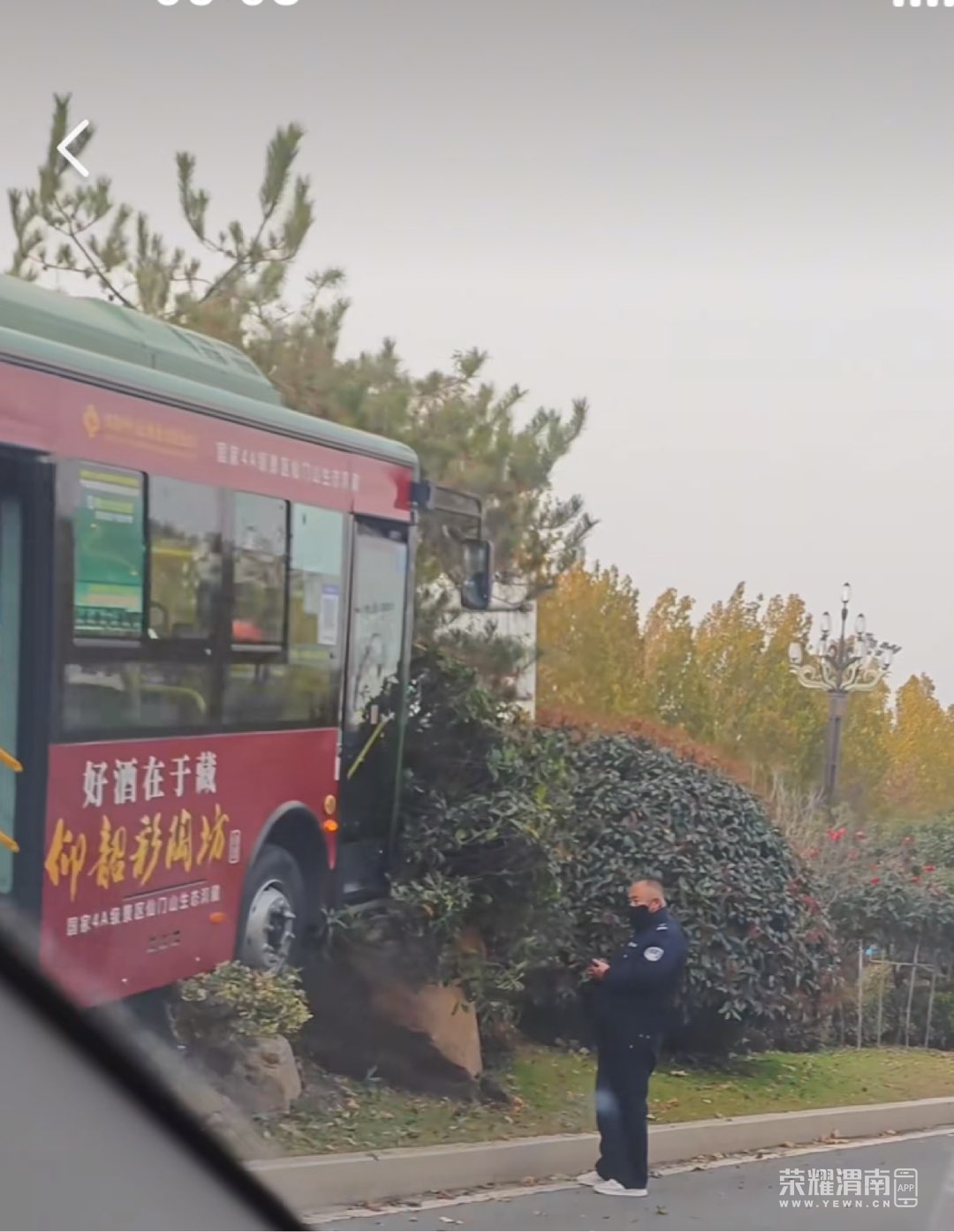 仓程路南段渭南一公交车“起飞”失败开到了绿化带里!