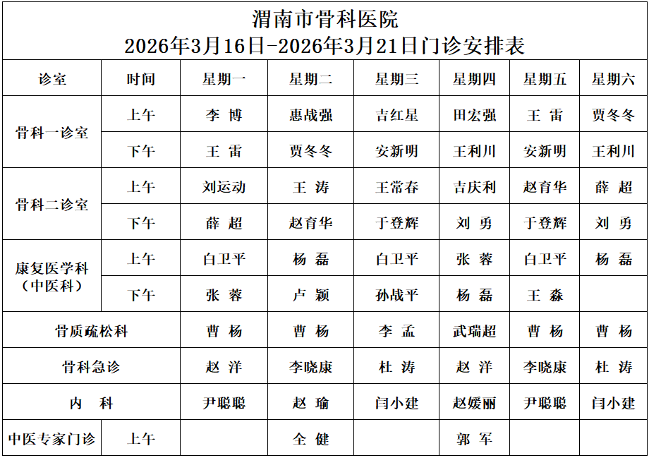 渭南市骨科医院2025年10月9日-10月18日门诊安排表