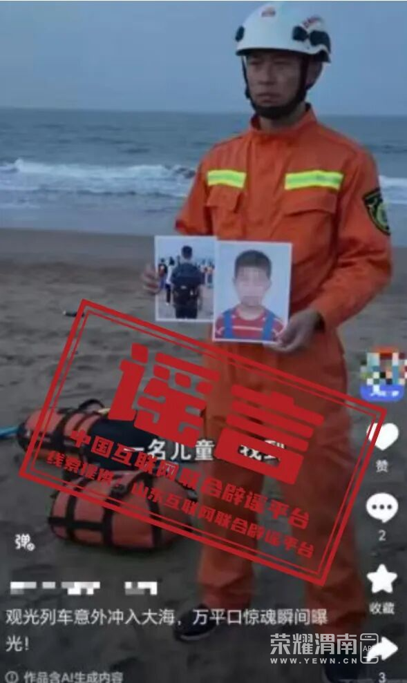 详情:3月17日,某网民在社交平台发布视频“观光列车意外冲入大海,万平口惊魂瞬间曝光!”,视频中称“山东日照万平口景区突发观光列车入海事件,有游客受伤失踪,失联人员含杭州摄影团队、合肥亲子游家庭,具体伤亡数字应急管理局暂未公布,请等待官方通报”,并配以AI生成画面,引发网民讨论。经当地应急、消防等部门核实,山东日照并未发生所谓“观光列车入海”事件,相关信息系谣言。(来源:山东互联网联合辟谣平台、日照市网络举报辟谣平台)