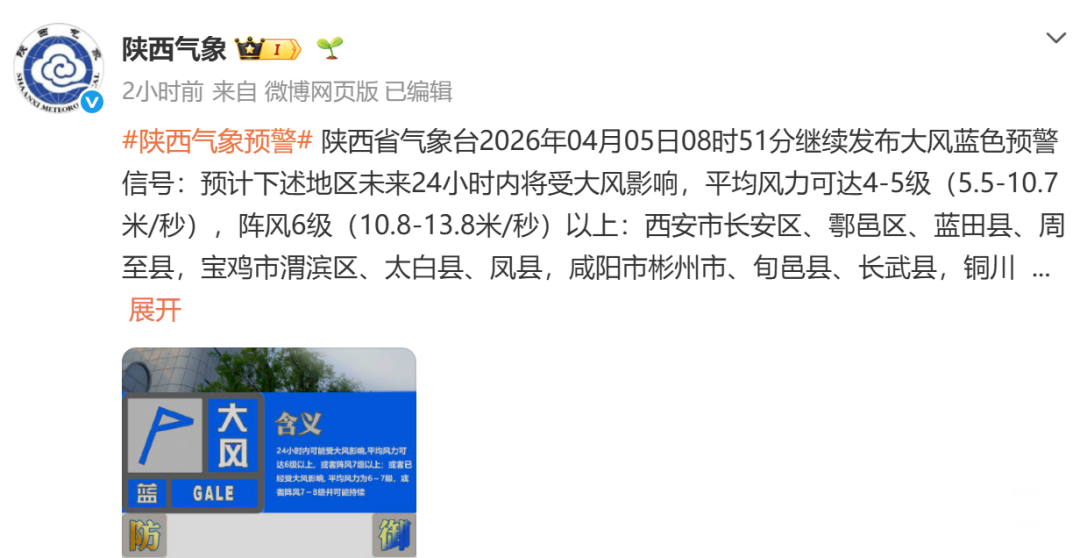 陕西省气象台2026年04月05日08时51分继续发布大风蓝色预警信号:预计下述地区未来24小时内将受大风影响,平均风力可达4-5级(5.5-10.7米/秒),阵风6级(10.8-13.8米/秒)以上:西安市长安区、鄠邑区、蓝田县、周至县,宝鸡市渭滨区、太白县、凤县,咸阳市彬州市、旬邑县、长武县,铜川市全域,渭南市韩城市、华阴市、华州区、潼关县、澄城县、合阳县、蒲城县、富平县、白水县,延安市全域,榆林市定边县、靖边县,汉中市城固县、洋县、勉县、略阳县、留坝县、佛坪县,安康市宁陕县,商洛市商州区、洛南县、镇安县、柞水县。受大风影响榆林北部有沙尘天气,请注意防范