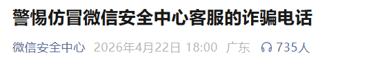 4月22日,“微信安全中心”微信公众号发布一则提醒,全文如下: